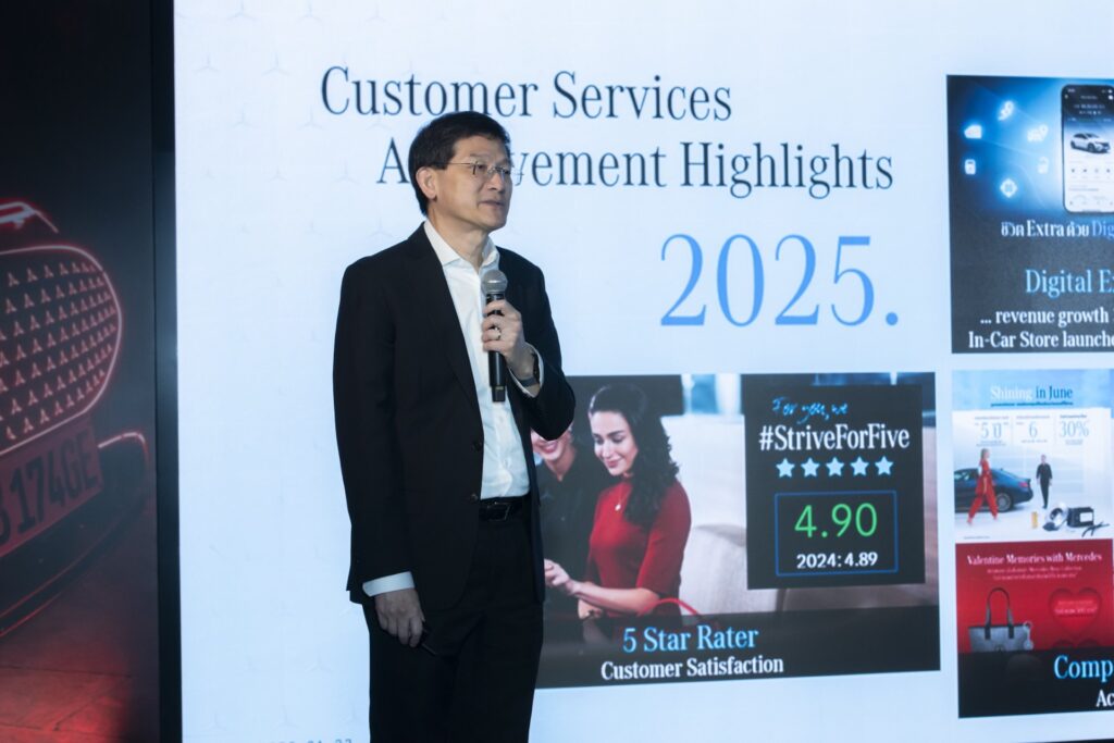 นายพุทธิ ตุลยธัญ รองประธานเจ้าหน้าที่บริหารและกรรมการฝ่ายบริการลูกค้า บริษัท เมอร์เซเดส-เบนซ์ (ประเทศไทย) จำกัด ได้กล่าวถึงความสำเร็จและวิสัยทัศน์ด้านบริการลูกค้าว่า “ในปี 2568 ที่ผ่านมา ฝ่ายบริการลูกค้าประสบความสำเร็จอย่างโดดเด่น โดยคว้าอันดับที่ 2 ในการรักษาลูกค้าของเมอร์เซเดส-เบนซ์ ในระดับภูมิภาค และได้รับคะแนนความพึงพอใจของลูกค้า (5 Star Rater) สูงถึง 4.90 คะแนน โดยมีการเปิดตัวบริการใหม่ อาทิ Mercedes-Benz In-Car Store ในเดือนธันวาคม เพื่อให้ลูกค้าสามารถอัปเกรดหรือต่ออายุแพ็กเกจ Digital Extras ได้อย่างง่ายดายผ่านหน้าจอรถยนต์รุ่นที่รองรับ* รวมถึงการนำเสนอโปรแกรม Service Select ทางเลือกใหม่สำหรับการบำรุงรักษารถยนต์ที่มีอายุ 7 ปีขึ้นไป* พร้อมเสริมพอร์ตโฟลิโออะไหล่แท้เมอร์เซเดส-เบนซ์ ด้วย StarParts ซึ่งเป็นอะไหล่กลุ่มบำรุงรักษาที่คุ้มค่าสำหรับรถยนต์อายุ 5 ปีขึ้นไปโดยเฉพาะ และการแนะนำระบบ XENTRY Workshop เพื่อยกระดับประสบการณ์ดิจิทัลของลูกค้าให้ดียิ่งขึ้น