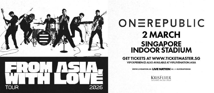 วงป็อปร็อกระดับโลก OneRepublic เตรียมกลับมาอีกครั้งที่สิงคโปร์ในรอบหลายปี กับคอนเสิร์ต “From Asia, With Love” Tour 2026 โชว์นี้จะอัดแน่นด้วยเพลงฮิตระดับโลกและผลงานใหม่ เพื่อเฉลิมฉลองสายสัมพันธ์อันแน่นแฟ้นกับแฟนเพลงชาวเอเชีย โดยสิงคโปร์เป็นหนึ่งในหมุดหมายสำคัญของทัวร์ครั้งนี้ สามารถดูข้อมูลเพิ่มเติมเกี่ยวกับบัตรเข้าชมได้ที่นี่