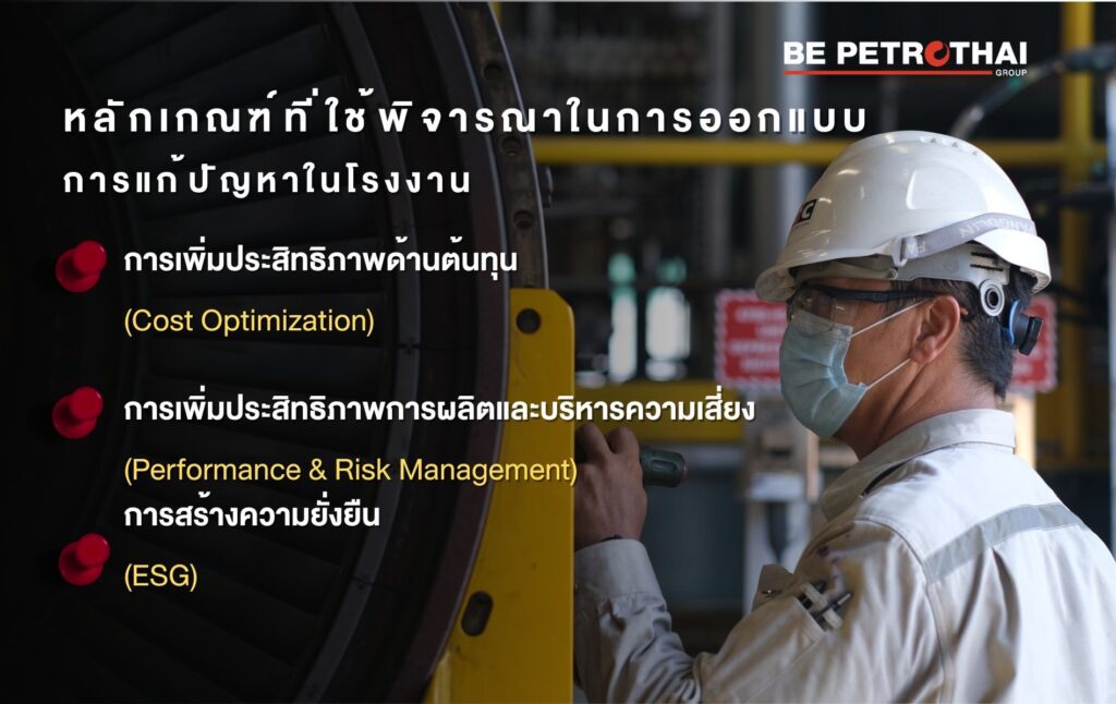 คุณตาม จำนงค์อาษา ผู้บริหาร BE Petrothai Group กล่าวว่า “เราเชื่อว่า การแก้ปัญหาเฉพาะจุดในโรงงานไม่เพียงพออีกต่อไป การที่กลุ่มบริษัทเป็นพันธมิตรกับผู้ผลิตเทคโนโลยีระดับโลกมานาน และทีมงานเห็นภาพรวมการทำงานของทั้งระบบ ทำให้มีความรู้ในเชิงลึกของตัวอุปกรณ์ เครื่องจักร ในฐานะเป็นที่ปรึกษาเชิงกลยุทธ์ ด้านระบบและอุปกรณ์ในโรงงาน เราทำ Engineering management วางโครงสร้างข้อมูล ทำให้สามารถวิเคราะห์ และออกแบบการแก้ปัญหาของโรงงานทั้งระบบ ด้วยการใช้ AI ผ่าน Dashboard ร่วมกับลูกค้า เพื่อให้เห็นภาพตรงกันและสร้างความยืดหยุ่น มั่นคงให้ธุรกิจ โดยมีเสาหลัก 3 ข้อ ซึ่งเป็นเกณฑ์ที่ลูกค้าใช้พิจารณา ได้แก่ การเพิ่มประสิทธิภาพด้านต้นทุน (Cost Optimization), การเพิ่มประสิทธิภาพการผลิตและบริหารความเสี่ยง (Performance & Risk Management), การสร้างความยั่งยืน (ESG)”