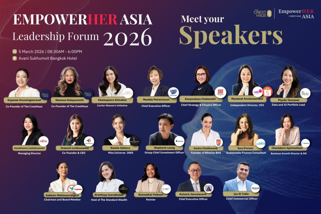 The CrestHaus เปิดประสบการณ์กับสุดยอดเวทีเสวนารวมผู้หญิงเก่งแนวหน้าระดับบอร์ดและผู้บริหารองค์กร จากองค์กรระดับชาติและเอเชีย ไว้มากที่สุด ในงานเสวนา “EmpowerHER Asia Leadership Forum 2026” ภายใต้แนวคิด “Write Your Next Chapter” สนับสนุนให้คุณ “กล้าเขียนอนาคตการเป็นผู้นำในแบบฉบับของตัวเอง” พร้อมผลักดันให้ผู้หญิงก้าวข้ามขีดจำกัด กล้าคิดกล้าทำ และออกแบบกรอบความคิดใหม่ๆ จากผู้นำหญิงระดับบอร์ดและ C-Suite ที่ประสบความสำเร็จจากหลายองค์กร อาทิ คุณกอบกาญน์ วัฒนวรางกูร ประธานกรรมการธนาคารกสิกรไทย และบริษัท โตชิบา ไทยแลนด์ จำกัด, คุณมุกดา ไพรัชเวทย์ ประธานเจ้าหน้าที่บริหาร บริษัทโอสถสภา จำกัด (มหาชน), คุณกันยารัตน์ โชคอุ่นกิจ ประธานเจ้าหน้าที่บริหารสายงานกลยุทธ์และการเงิน บจก.เดอะมอลล์ กรุ๊ป, คุณกนกกมล เลาหบูรณะกิจ กรรมการผู้จัดการ บริษัท ฟูจิตสึ (ประเทศไทย) จำกัด, คุณปิยดา ตันไสว Data and AI Portfolio Lead บริษัท ไอบีเอ็ม ดิจิตอล ทาเล้นท์ ฟอร์ บิสสิเนส จำกัด (IBMDT), คุณชลกร อภิชาติธรรม ผู้อำนวยการฝ่ายการตลาด ธุรกิจอาหารและขนมขบเคี้ยว เป๊ปซี่โค ภูมิภาคอินโดจีน, คุณเชอรี่ เข็มอัปสร สิริสุขะ และ คุณนาตาลี เกลโบวา นางงามจักรวาลปี 2548 เป็นต้น