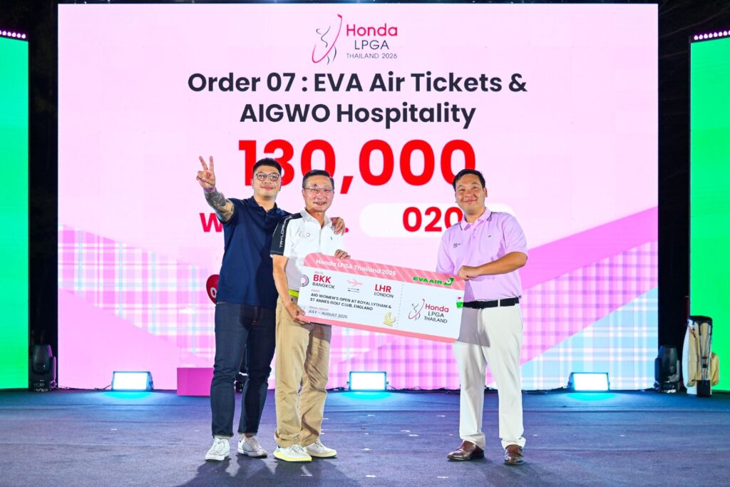 พร้อมกันนี้ยังมีแพ็กเกจพิเศษ บัตรโดยสารเครื่องบินชั้นธุรกิจ กรุงเทพฯ–ลอนดอน 2 ที่นั่ง จากสายการบิน EVA Air พร้อมสิทธิ์ VIP Hospitality เข้าชมการแข่งขัน AIG Women’s Open 2026 ที่สนาม Royal Lytham & St. Annes ประเทศอังกฤษ โดยผู้ที่ชนะการประมูล คือ คุณวัชรพล พันธุ์เณร ผู้อำนวยการอาวุโสด้านกลยุทธ์การตลาด บริษัท ไอเอ็มจี เซอร์วิสเซส (ประเทศไทย) จำกัด ในราคา 130,000 บาท