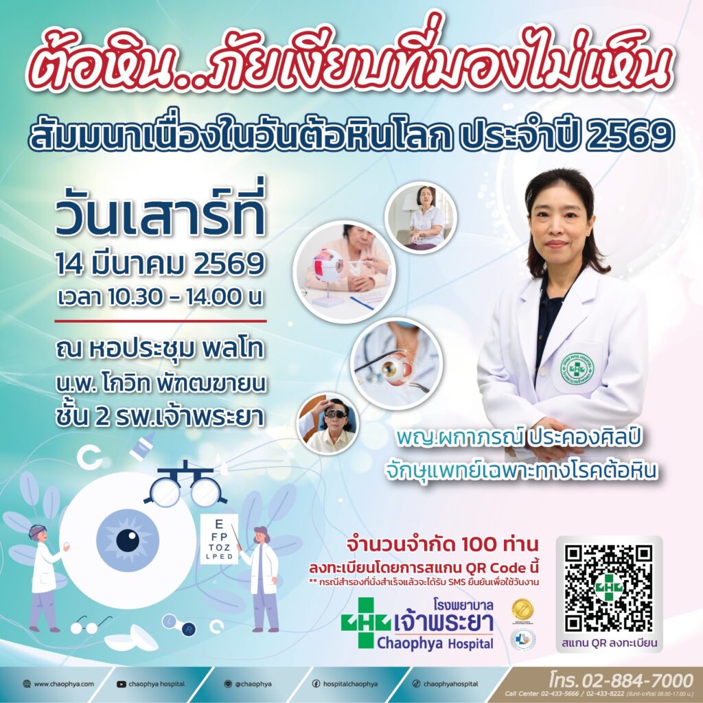 โรงพยาบาลเจ้าพระยาขอเชิญร่วมสัมมนาเนื่องในวันต้อหินโลก ประจำปี 2569 โดยไม่เสียค่าใช้จ่าย ภายใต้หัวข้อ “ต้อหิน…ภัยเงียบที่มองไม่เห็น” เพื่อเสริมสร้างความรู้ ความเข้าใจ และตระหนักถึงความสำคัญของการตรวจคัดกรองโรคต้อหิน ซึ่งเป็นอีกสาเหตุหนึ่งของภาวะสูญเสียการมองเห็นอย่างถาวร หากไม่ได้รับการวินิจฉัยและรักษาอย่างทันท่วงที พบกันวันเสาร์ที่ 14 มีนาคม 2569 เวลา 10.30 – 14.00 น. ณ หอประชุม พลโท น.พ.โกวิท พัฑฒฆายน ชั้น 2 รับฟังการบรรยายโดย พญ.ผกากรณ์ ประคองศิลป์ จักษุแพทย์เฉพาะทางโรคต้อหิน สามารถลงทะเบียนผ่าน QR Code หรือสอบถามได้ที่ไลน์ @chaophya
