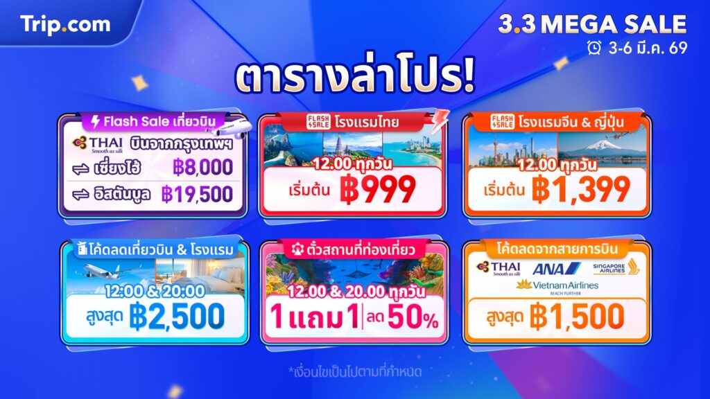 Trip.com แพลตฟอร์มการท่องเที่ยวออนไลน์ชั้นนำ จัดแคมเปญใหญ่ โปรโมชัน 3.3 Mega Sale ระหว่างวันที่ 3-6 มีนาคม 2569 พร้อมดีลท่องเที่ยวสุดคุ้ม โปรโมชันครั้งนี้มีไฮไลท์เป็นดีลโรงแรมในไทยลด 50%* ตั๋วเครื่องบินราคาพิเศษ และส่วนลดอื่นๆ ที่ครอบคลุมสถานที่ท่องเที่ยวและบริการท่องเที่ยวทั่วโลก โดยโปรโมชัน 3.3 Mega Sale มีดีลท่องเที่ยวที่หลากหลายมาให้จองตลอดทั้งวัน เพื่อให้นักเดินทางสามารถเลือกดีลที่ตรงกับความต้องการในการเดินทางได้