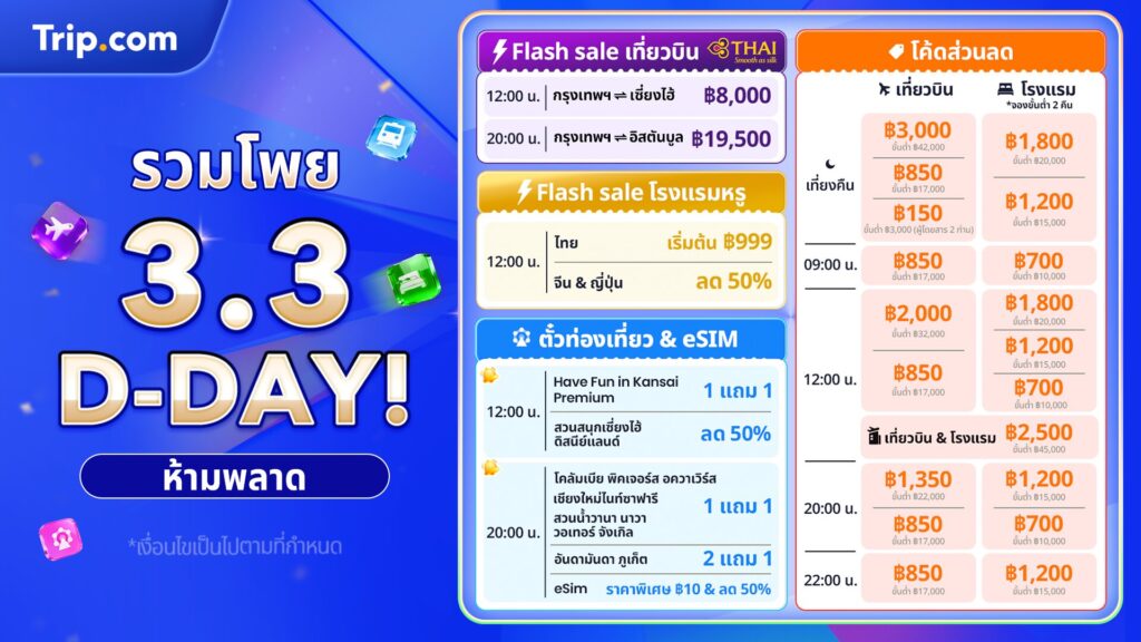 แคมเปญ 3.3 Mega Sale จาก Trip.com นำเสนอโปรโมชันพิเศษมากมาย ไม่ว่าจะเป็น Flash Sale ลด 50%* สำหรับการจองที่พัก เปิดจองวันละ 2 รอบ เวลา 12.00 น. และ 20.00 น. ตลอดวันที่ 3-6 มีนาคม 2569