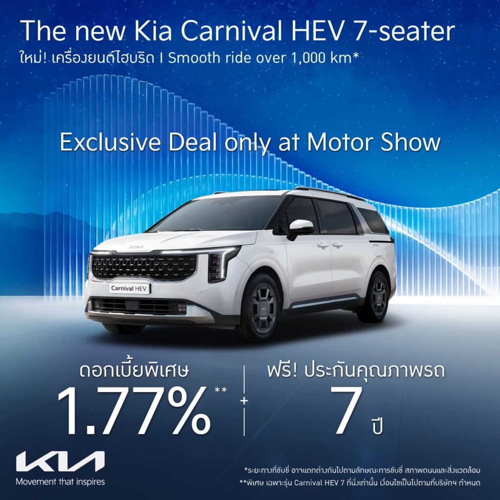 บริษัท เกีย เซลส์ (ประเทศไทย) ประกาศโปรโมชันสุดพิเศษสําหรับงาน Motor Show 2026 งานยานยนต์ชั้นนําของประเทศไทยซึ่งเป็นโปรโมชันสุดพิเศษอย่างที่ไม่เคยมีมาก่อน มอบโอกาสในการเป็นเจ้าของ The Kia Carnival Diesel 11 ที่นั่ง ในราคาพิเศษ เพียง 1,999,000 บาท คิดเป็นส่วนลด 595,000 บาท (เฉพาะสี Astra blue โดยสี Snowflake white pearl, Jet black และMeteor gray รับส่วนลด 575,000 บาท). แคมเปญสุดพิเศษนี้จัดขึ้นตั้งแต่วันที่ 6 มีนาคม ถึง 30 เมษายน 2569 เท่านั้น ที่ งาน Motor Show 2026 ณ บูทเกียหมายเลข A12/1 อิมแพ็ค ชาเลนเจอร์ ฮอลล์ 2 เมืองทองธานี และโชว์รูมเกียทั่วประเทศ