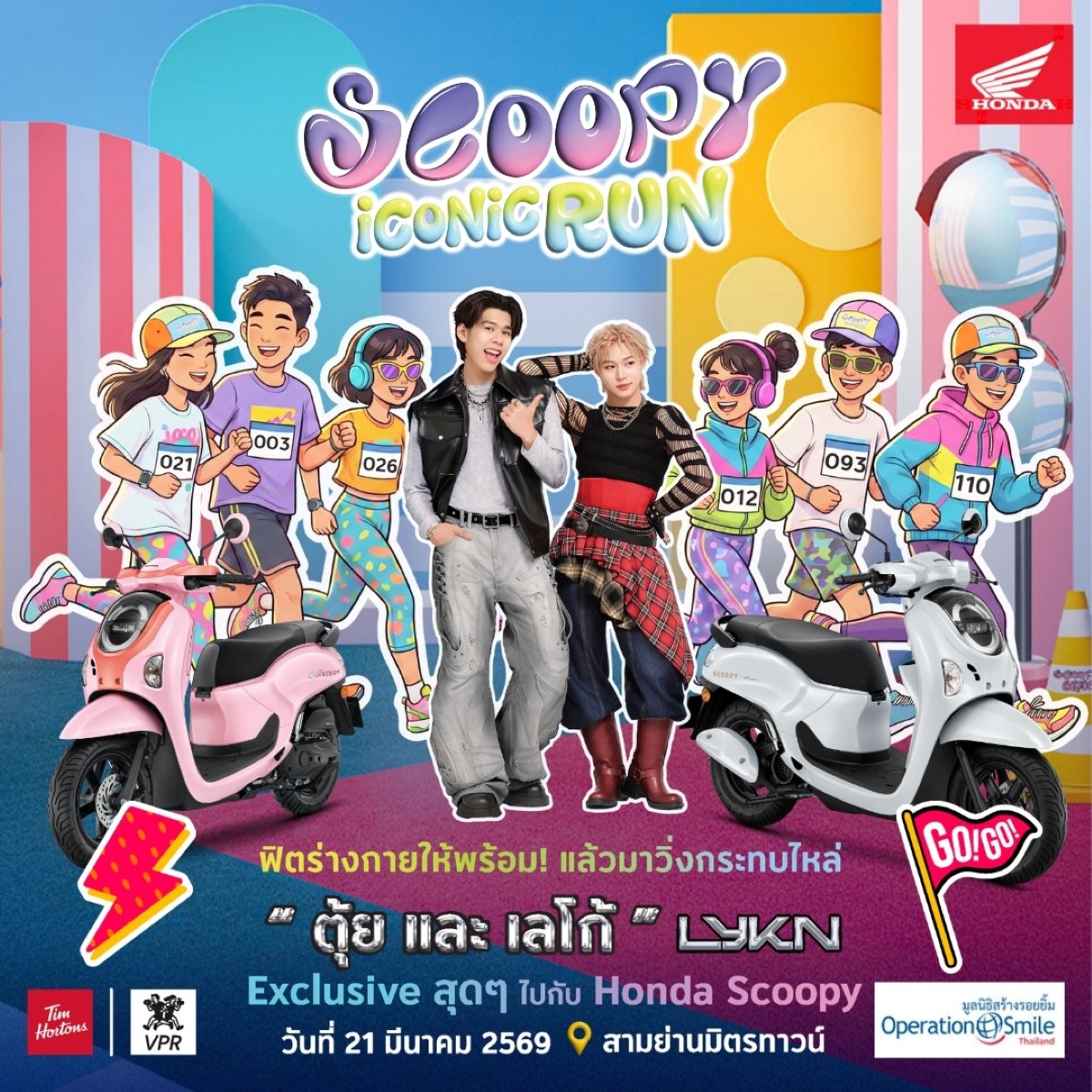 รถจักรยานยนต์ฮอนด้า ชวนแก๊งเจนใหม่และผู้รักการออกกำลังกายทุกคน มาร่วมสร้างสีสันยามเช้ากลางเมืองกับกิจกรรม “Scoopy iCONiC Run” งานวิ่งที่ผสานความสนุกของการเคลื่อนไหวเข้ากับแฟชั่น และพลังของคอมมูนิตี้คนรุ่นใหม่ในสไตล์ไอคอนิก พร้อมชวนทุกคนออกมาใช้ชีวิตให้แอ็กทีฟ พร้อมวิ่งกระทบไหล่ไปกับ ตุ้ย และเลโก้จากวง LYKN พรีเซนเตอร์ New Honda SCOOPY เตรียมพบกันในวันที่ 21 มีนาคม 2569 เวลา 06.30–09.00 น. ณ สามย่านมิตรทาวน์