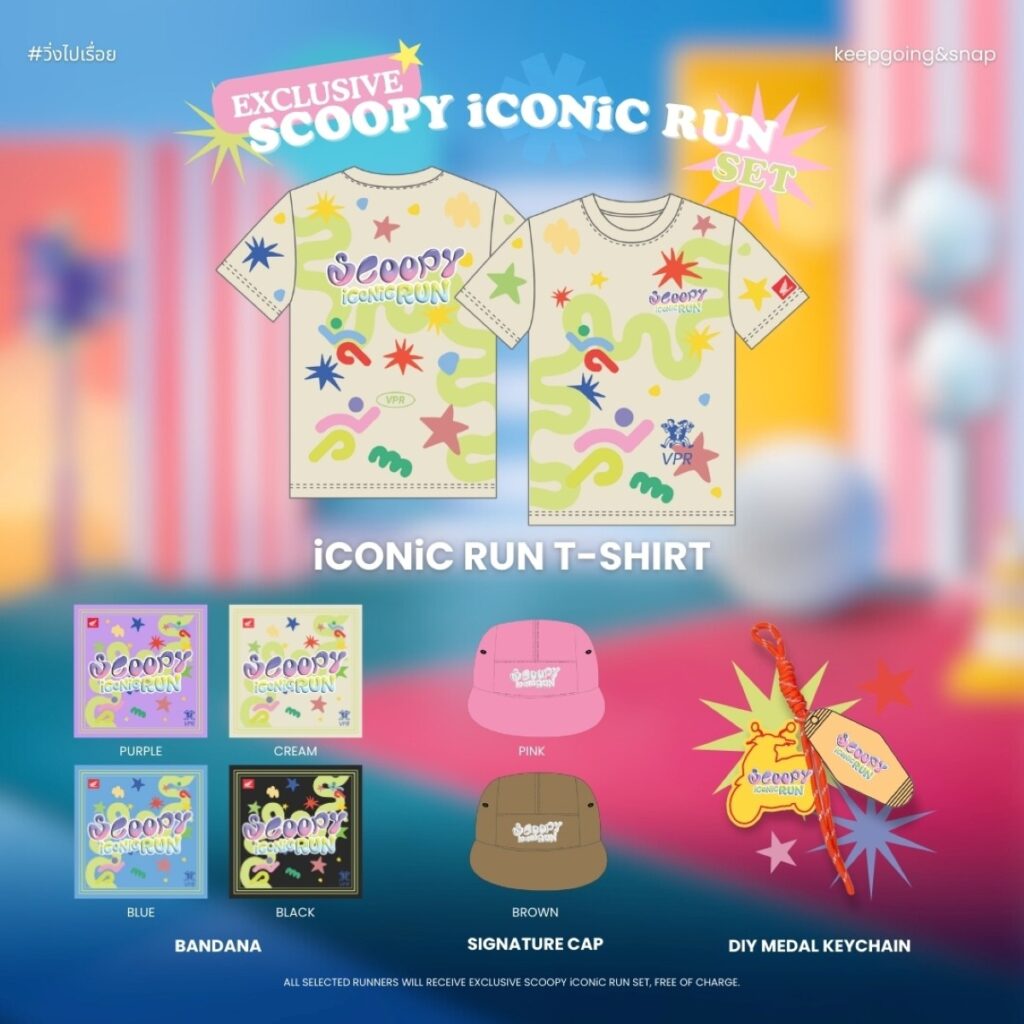 ผู้ที่ได้รับคัดเลือกจะได้รับ Exclusive Scoopy iCONiC Run Set Collection สุดลิมิเต็ดที่จัดเต็มเพื่อชาว iCONiC โดยเฉพาะ ได้แก่ iCONiC RUN T-SHIRT ดีไซน์สีสันสดใส, Bandana ลายสุดคิวต์, Signature Cap ไอเทมคอมพลีตลุค และ DIY Medal Keychain ของที่ระลึกสุดเก๋ไว้พกติดตัวหลังเข้าเส้นชัย ทั้งนี้มี ค่าสมัคร 100 บาท ชำระในวันจัดกิจกรรม และ รายได้ทั้งหมดมอบให้มูลนิธิสร้างรอยยิ้ม Operation Smile Foundation เพื่อร่วมส่งต่อรอยยิ้มให้กับสังคม