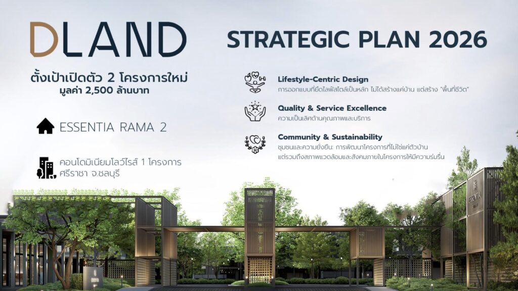 นายสุเทพ ปัญญาสาคร เสริมถึงทิศทางการเติบโตของดี-แลนด์ กรุ๊ปว่า “ในปีที่ผ่านมา 2568 บริษัทในเครือสามารถทำยอดขายรวมได้ 800 ล้านบาท และในปี 2569 เราจะเปิดตัวโครงการใหม่ 2 โครงการ มูลค่ารวม 2,500 ล้านบาท ประกอบด้วยโครงการบ้านเดี่ยวอย่างเอสเซนเทีย พระราม 2 และคอนโดมิเนียม Low-Rise อีก 1 โครงการในศรีราชา จังหวัดชลบุรี สอดรับกับวิสัยทัศน์ของดี-แลนด์ กรุ๊ป ในการขยายพอร์ตโฟลิโอสู่ทำเลศักยภาพใหม่ในหัวเมืองที่กำลังเติบโต พร้อมยึดมั่นในหลักการพัฒนาโครงการที่ ส่งเสริมคุณภาพชีวิตและสุขภาวะ ในฐานะผู้พัฒนาที่อยู่อาศัยที่ตั้งใจสร้างสภาพแวดล้อมที่ทำให้ผู้อยู่อาศัยมีชีวิตที่ดีขึ้นในทุกวัน”