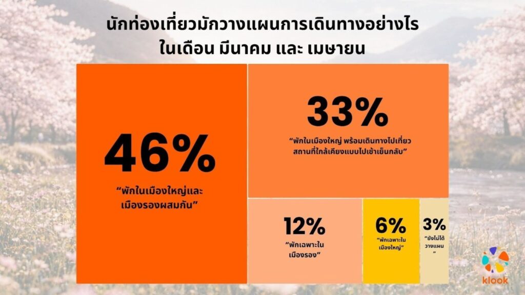 พฤติกรรมที่น่าสนใจคือ 7 ใน 10 ของนักท่องเที่ยววางแผนจองกิจกรรม ทัวร์ หรือสถานที่ท่องเที่ยวภายในเวลาไม่เกิน 2 เดือนก่อนเดินทาง สะท้อนถึงเทรนด์การจองกิจกรรมเที่ยวในระยะเวลาสั้น เพราะต้องการความยืดหยุ่นเพื่อให้สามารถปรับตามการพยากรณ์ช่วงดอกไม้บานและสภาพอากาศที่เปลี่ยนแปลงได้