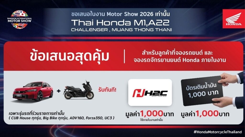 ฮอนด้า มอบข้อเสนอสุดคุ้มสำหรับลูกค้าที่จองรถยนต์ Honda ภายในงาน Motor Show 2026 เติมเต็มประสบการณ์การเดินทางในแบบ “Complete Your Honda Garage” ด้วยสิทธิพิเศษจากรถจักรยานยนต์ฮอนด้า ทั้งกิจกรรมลุ้นรับของรางวัลและคูปองสิทธิประโยชน์ รวมมูลค่าสูงสุดกว่า 1,300 บาท ระหว่างวันที่ 25 มีนาคม – 5 เมษายน 2569 ณ อาคารชาเลนเจอร์ฮอลล์ 1 อิมแพ็ค เมืองทองธานี