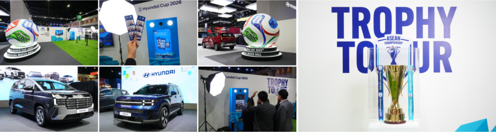 สำหรับบูทฮุนไดในปีนี้ ออกแบบภายใต้คอนเซปต์ “Hyundai Lifestyle Connected Hub” ที่ผสานโลกของยนตรกรรม เทคโนโลยี และไลฟ์สไตล์เข้าด้วยกัน นำกลยุทธ์ Sport Marketing จากธีมระดับโลกของแบรนด์อย่าง “Year of Football” มาสร้างประสบการณ์ใหม่ให้ผู้เข้าชมงาน ด้วยการจัดแสดงลูกฟุตบอลขนาดยักษ์ Trionda ลูกฟุตบอลที่ใช้ในการแข่งขัน FIFA World Cup 26™ อย่างเป็นทางการ ซึ่งสะท้อนพลังของเจ้าภาพทัวร์นาเมนต์ทั้ง 3 ประเทศ นำมาเป็นแลนด์มาร์กของบูท พร้อมมอบโอกาสสุดเอ็กซ์คลูซีฟกับการได้ใกล้ชิดกับถ้วยแชมป์อาเซียน ASEAN Hyundai Cup™ 2026 Trophy ที่นำมาให้แฟนฟุตบอลได้ชมและถ่ายภาพเป็นที่ระลึก ซึ่งเป็นอีกหนึ่งไฮไลต์สำคัญที่สะท้อนบทบาทของฮุนไดในฐานะพันธมิตรของวงการฟุตบอลระดับโลก ซึ่งถือเป็นกีฬาที่เป็นสัญลักษณ์แห่งการเชื่อมโยงผู้คน ตอกย้ำการนำไลฟ์สไตล์มารวมกับนวัตกรรมการเดินทางของฮุนได