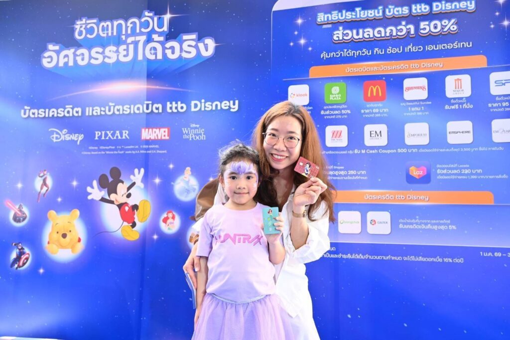 ขณะเดียวกัน ผู้เข้าร่วมงานยังสามารถพบกับ ttb Disney Booth ภายในงาน Disney On Ice ตั้งแต่วันที่ 27 มีนาคม 2569 – 5 เมษายน 2569 พร้อมร่วมสมัครบัตรเดบิต ttb all free Disney ที่มอบสิทธิประโยชน์ รับเงินคืน 1% ในทุกวัน และรับเงินคืน 2% ในวันดับเบิลเดย์ สำหรับทุกยอดการใช้จ่ายออนไลน์ พร้อม e-Slip ลายพิเศษเอ็กซ์คลูซีฟเฉพาะผู้ถือบัตร และสมัครบัตรเครดิต ttb Disney ที่ให้คะแนนสะสม 5 เท่าในหมวดออนไลน์ ร้านอาหาร และซูเปอร์มาร์เก็ต และผ่อนชำระ 0% สูงสุด 6 เดือนกับร้านค้าดิสนีย์ที่ร่วมรายการ