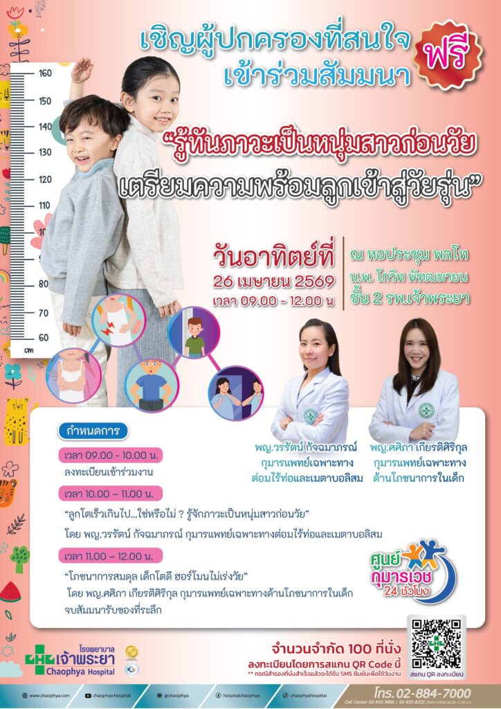 โรงพยาบาลเจ้าพระยาขอเชิญผู้ปกครองเข้าร่วมสัมมนาภายใต้หัวข้อ “รู้ทันภาวะเป็นหนุ่มสาวก่อนวัย เตรียมความพร้อมลูกเข้าสู่วัยรุ่น” วิทยากรโดยทีมกุมารแพทย์เฉพาะทาง พบกันวันอาทิตย์ที่ 26 เมษายน 2569 เวลา 09.00 – 12.00 น. ณ ห้องประชุม พลโท น.พ.โกวิท พัฑฒฆายน ชั้น 2 โรงพยาบาลเจ้าพระยา ภายในงานมีการบรรยายให้ความรู้เกี่ยวกับภาวะเด็กโตเร็วผิดปกติ สัญญาณเตือนของการเข้าสู่วัยหนุ่มสาวก่อนวัย รวมถึงโภชนาการที่เหมาะสมต่อการเจริญเติบโตของเด็ก รับจำนวนจำกัดเพียง 100 ที่นั่งโดยไม่มีค่าใช้จ่าย ผู้สนใจสามารถลงทะเบียนได้โดยการสแกน QR Code หรือคลิกที่ลิ้งนี้ https://forms.gle/KGsehzUu1Nfw4gdL6 สอบถามเพิ่มเติมที่ไลน์ @chaophya