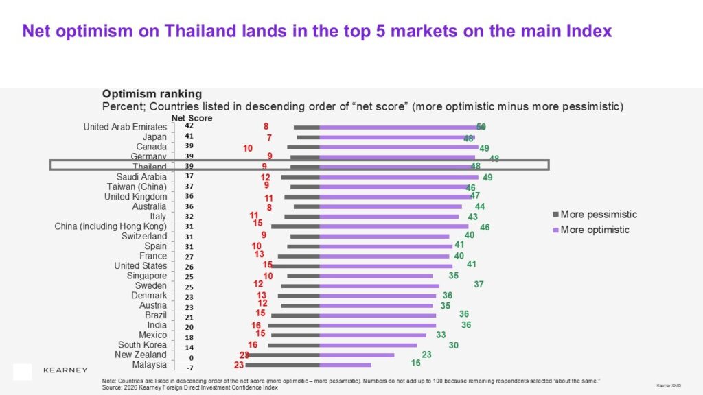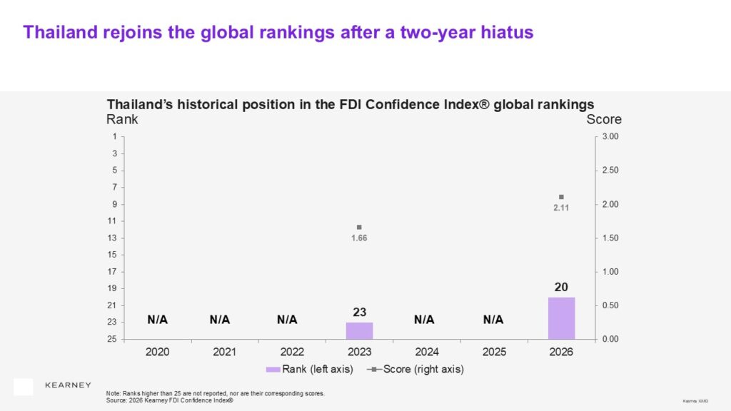 ประเทศไทยกลับมาติด 25 อันดับแรกของดัชนีความเชื่อมั่นด้านการลงทุนโดยตรงจากต่างประเทศ (FDICI) ของคาร์นีย์ (Kearney) ในปี 2569 (Kearney’s 2026 FDI Confidence Index®) หลังจากครั้งล่าสุดในปี 2566 โดยการสำรวจผู้บริหารธุรกิจระดับโลกประจำปีนี้ได้จัดอันดับตลาดที่มีแนวโน้มสูงสุดในการดึงดูดการลงทุนโดยตรงจากต่างประเทศ (FDI) ในช่วง 3 ปีข้างหน้า