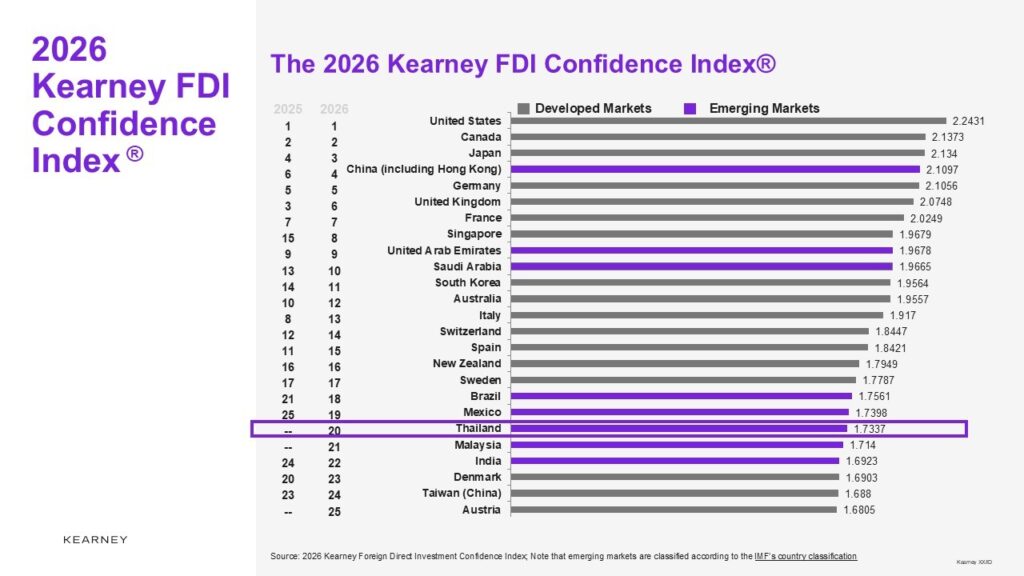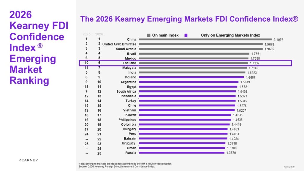 ตลาดเกิดใหม่ยังคงมีการเติบโตอย่างต่อเนื่องและเชื่อมโยงกับกระแสการลงทุนโลกมากขึ้น ทั้งไทยและมาเลเซียมีการปรับตัวขึ้นอย่างมีนัยสำคัญ (จากอันดับ 10 เป็น 6 และจากอันดับ 11 เป็น 7 ตามลำดับ) ในดัชนีความเชื่อมั่นด้านการลงทุนโดยตรงจากต่างประเทศสำหรับตลาดเกิดใหม่ของ Kearney ปี 2569 โดยเฉพาะไทยที่มีการปรับตัวขึ้นสูงสุดท่ามกลางการกระจายตัวของห่วงโซ่อุปทานที่ดำเนินอย่างต่อเนื่อง ในขณะที่จีนยังคงรักษาตำแหน่งผู้นำตลาดเกิดใหม่อันดับ 1 เป็นปีที่ 3 ติดต่อกัน