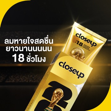 Closeup (ใกล้ชิด) แบรนด์ผลิตภัณฑ์ดูแลช่องปากภายใต้ Unilever Personal Care พร้อมจุดประกายความตื่นเต้นแฟนบอลชาวไทยรับกระแส FIFA World Cup 2026™ ในฐานะผู้สนับสนุนอย่างเป็นทางการ เปิดตัวยาสีฟันสูตรใหม่ล่าสุด Closeup Gold (Limited Edition) ให้แฟน ๆ ฟุตบอลชาวไทยได้ยกระดับช่วงเวลาการเชียร์บอลให้เป็นช่วงเวลาทองแห่งความใกล้ชิด ด้วยเทคโนโลยียาสีฟันเนื้อเจลสีทองล่าสุด ที่ผสาน Active Zinc เพื่อลมหายใจหอมสดชื่นยาวนานถึง 18 ชั่วโมง Closeup (ใกล้ชิด) พร้อมสานต่อภารกิจการสร้างความมั่นใจเพราะมีลมหายใจหอมสดชื่น ให้ทุกโมเมนต์ของความใกล้ชิดมีความหมายยิ่งกว่าที่เคย